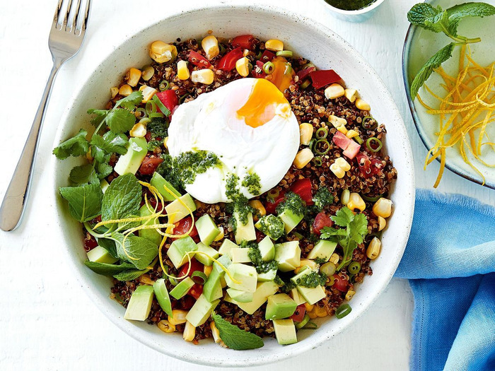 Start your day with a nourishing breakfast such as yoghurt with berries, chia seeds and a drizzle of honey, or a smoothie with greens powder and protein.