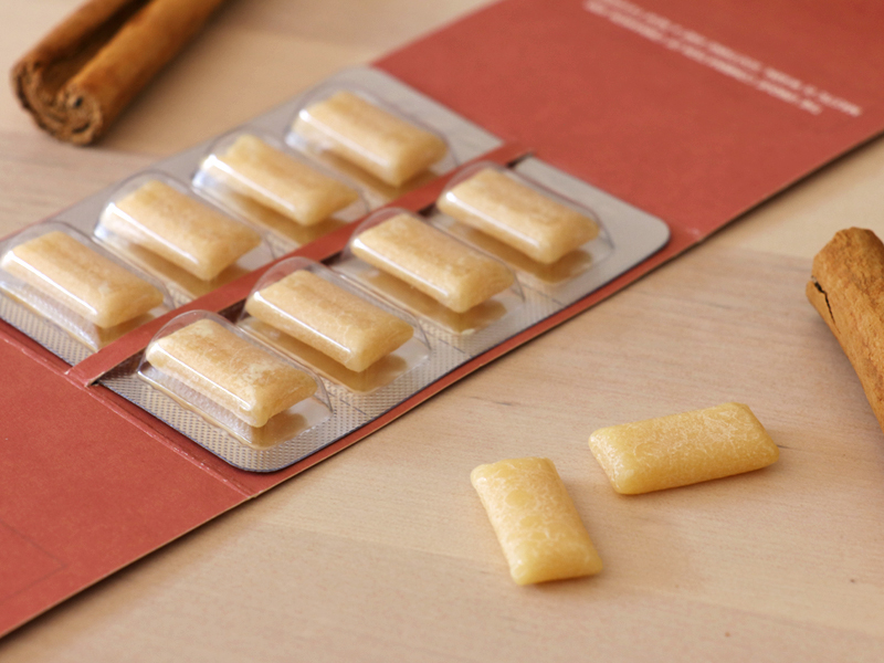 Plant based gum base, Beeswax, Xylitol, Maltitol, Essential Cinnamon Oil, Glazing agent (Acacia gum)